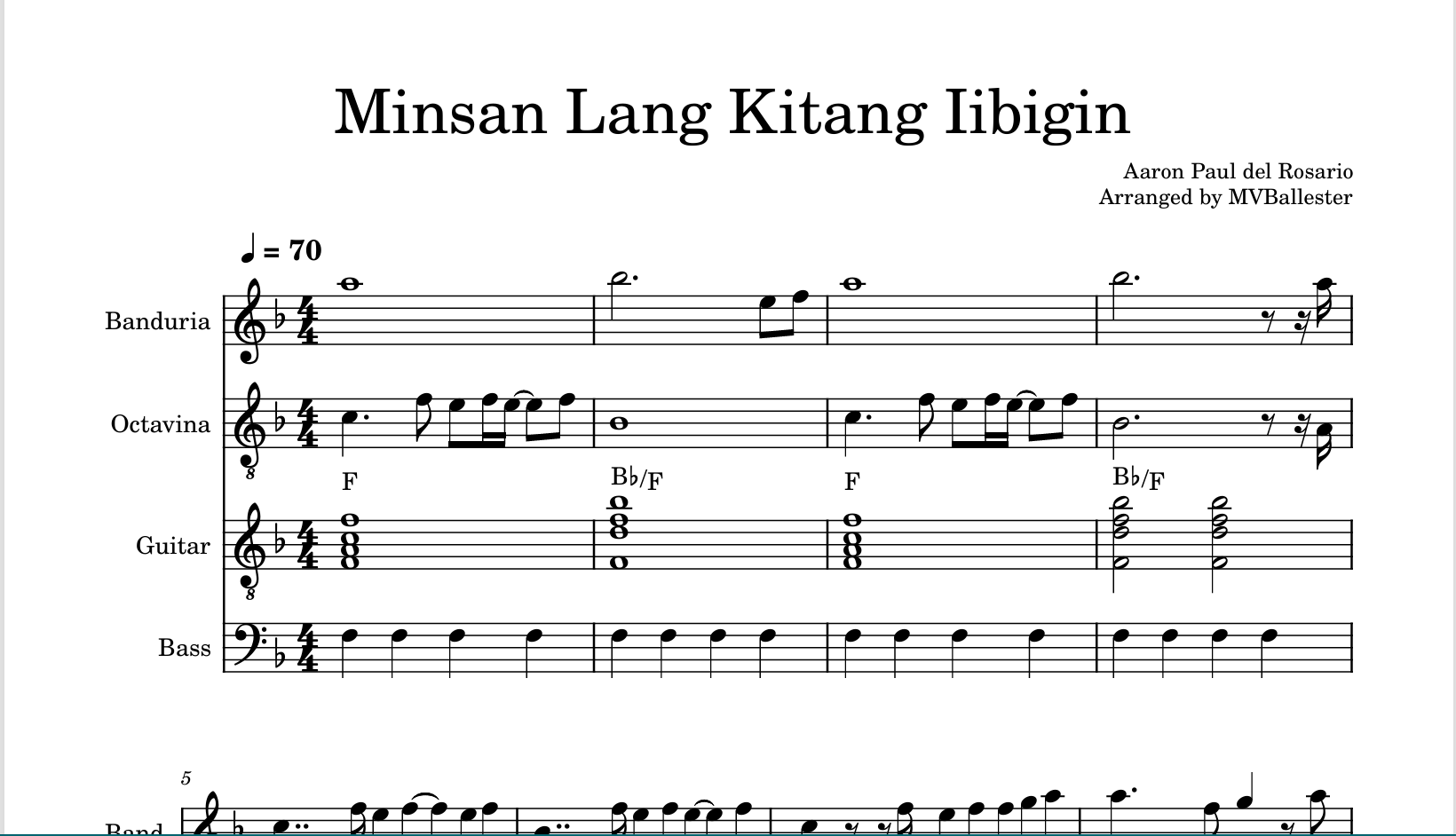 Minsan Lang Kita Iibigin, originally performed by Ariel Rivera, is presented here in a specialized rondalla arrangement by Mariefrance Vasquez Ballester. This adaptation transforms the beloved Filipino ballad into an ensemble piece, showcasing the distinctive warm tones and rhythmic interplay characteristic of traditional rondalla instrumentation. The arrangement preserves the emotional depth of the original composition while providing musicians with an accessible yet musically rich interpretation. Ideal for rondalla groups seeking to expand their repertoire with contemporary Filipino material that honors both traditional and modern musical sensibilities.